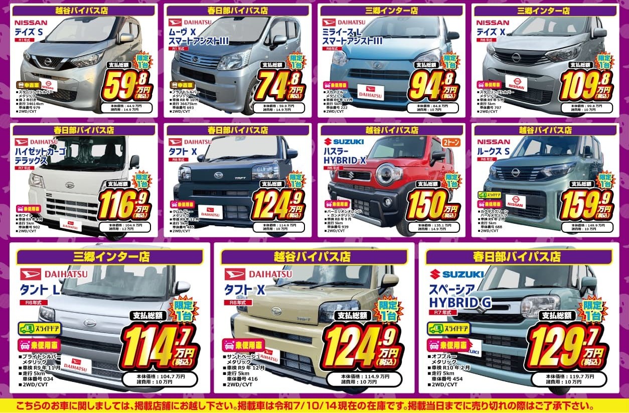 三郷市・越谷・春日部・吉川市・八潮市・松戸市・流山市・岩槻区・野田市・宮代町・松伏町・幸手市・久喜市・坂東市・白岡市・蓮田市エリアのお客様に喜んで頂けるよう安価な届出済軽未使用車(新古車)を多数ご用意しております!